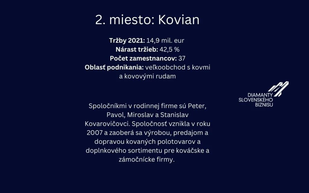 Kovian založili bratia Peter, Miroslav, Stanislav a Pavol Kovarovičovci v roku 2007. Všetci štyria už mali skúsenosti s podnikaním v strojárstve a stavebníctve. Rozhodli sa, že spoja sily, aby sa mohli posunúť ďalej – a podarilo sa. Aj vďaka tomu sa stali jedným z laureátov ocenenia Diamanty slovenského biznisu.